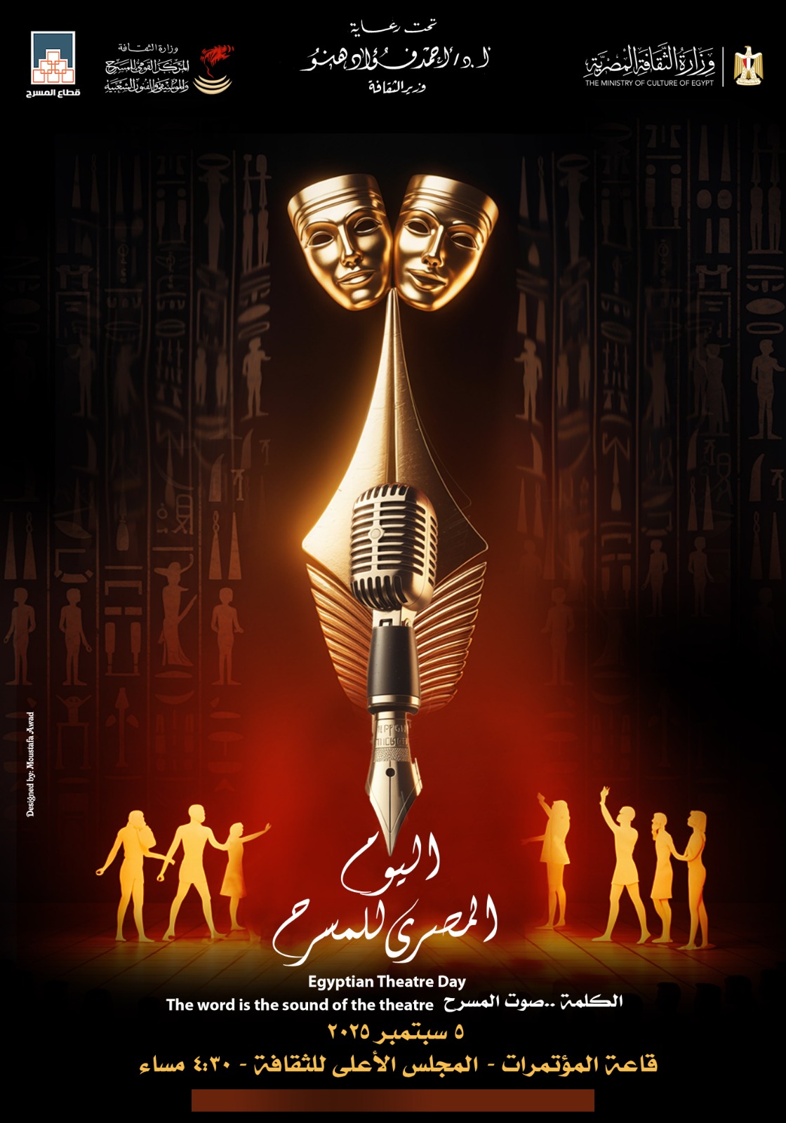 يحتفل مسرحيو مصر بـ"اليوم المصري للمسرح" بقاعة المؤتمرات بالمجلس الأعلي للثقافة، برعاية دكتور أحمد فؤاد هنو - وزير الثقافة، وإشراف المخرج خالد جلال - رئيس قطاع المسرح وذلك في تمام الرابعة والنصف مساء بعد غد الجمعة 5 سبتمبر 2025.
