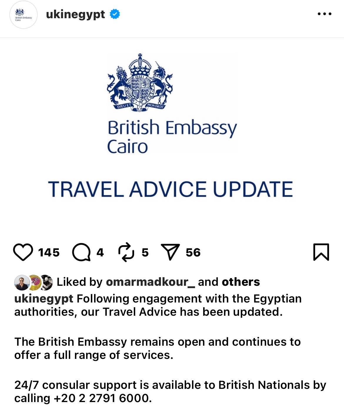 وأكدت السفارة، في بيان لها عبر صفحتها الرسمية، أن الدعم القنصلي متاح للمواطنين البريطانيين على مدار الساعة وطوال أيام الأسبوع عبر الاتصال على الرقم: +20 2 2791 6000.