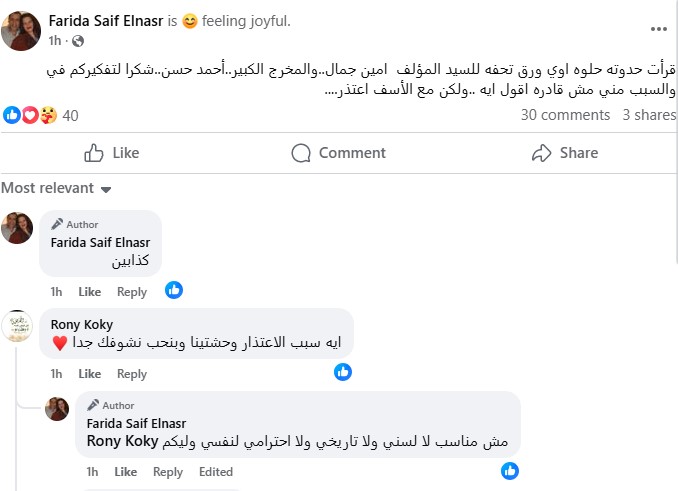 وكتبت فريدة سيف النصر منشور لها، من خلال حسابها الرسمي عبر موقع التواصل الاجتماعي "فيسبوك"، قالت: "قرأت حدوته حلوه اوي ورق تحفه للسيد المؤلف امين جمال..والمخرج الكبير..أحمد حسن..شكرا لتفكيركم في والسبب مني مش قادره اقول ايه ..ولكن مع الأسف اعتذر".
