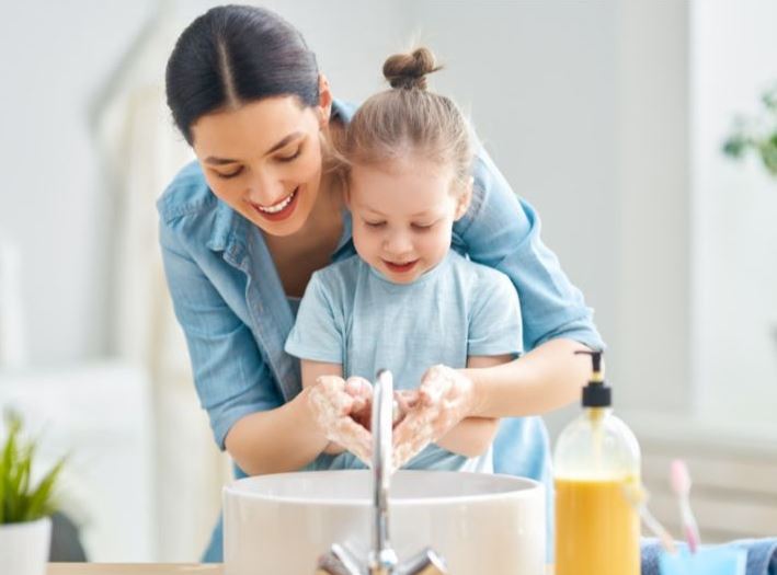 غسل اليدين من الخطوات الهامة للحفاظ على النظافة الشخصية فعليك تعليم طفلك أن يغسل يديه بعد استخدام الحمام، قبل تناول الطعام، وبعد اللعب أو لمس الأسطح المشترك باستخدام الصابون والماء لمدة 15 ثانية على الأقل.