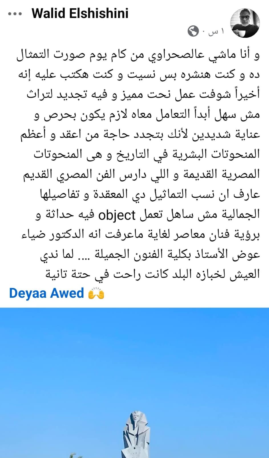 وعبرأحد الأشخاص عبر صفحته قائلا" عمل نحتي عظيم يضاف إلي لالراةائع المصرية .. تفصليات من العمل .. والعمل لاوال قيد التنفيذ والتفتيش"