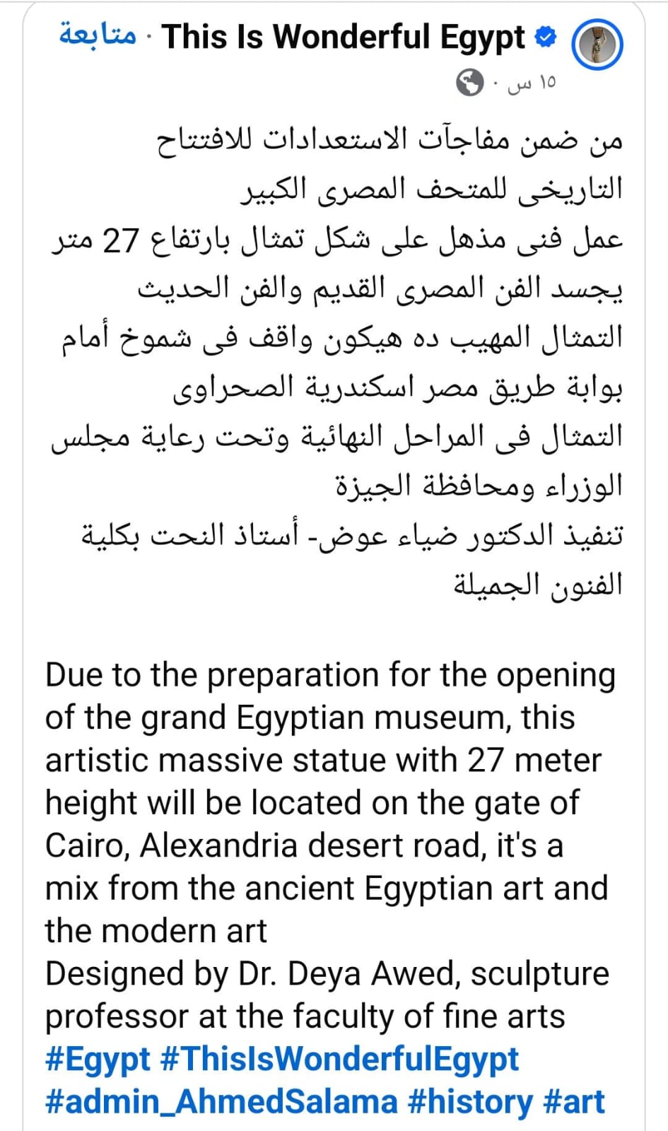 وذكرت أحدى الصفحات على حساب الرسمي ؛ “من ضمن مفاجآت الاستعدادات للافتتاح التاريخى للمتحف المصرى الكبير،عمل فنى مذهل على شكل تمثال بارتفاع 27 متر يجسد الفن المصرى القديم والفن الحديث ،التمثال المهيب ده هيكون واقف فى شموخ أمام بوابة طريق مصر اسكندرية الصحراوى، التمثال فى المراحل النهائية وتحت رعاية مجلس الوزراء ومحافظة الجيزة، تنفيذ الدكتور ضياء عوض- أستاذ النحت بكلية الفنون الجميلة”