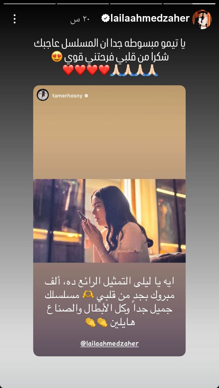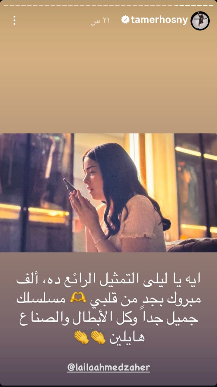 وكتب الفنان تامر حسني رسالة تهنئة للفنانة ليلى أحمد زاهر على مسلسلها الجديد عبر ستوري على موقع تبادل الصور والفيديوهات القصيرة "انسجرام"،قائلا"ايه يا ليلى التمثيل الرائع ده ألف مبروك بجد من قلبي مسلسلك جميل جدا وكل الأبطال والصناع هايلين".