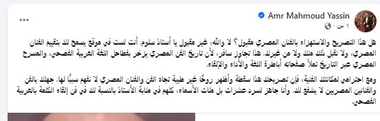 وأضاف" ومع احترامي لمكانتك الفنية، فإن تصريحك هذا سقطة وأظهر روحًا غير طيبة تجاه الفن والفنان المصري لا نفهم سببًا لها. جهلك بالفن والفنانين المصريين لا يشفع لك. وأنا جاهز لسرد عشرات بل مئات الأسماء، كلهم في مثابة الأستاذ بالنسبة لك في فن إلقاء الكلمة بالعربية الفصحى".