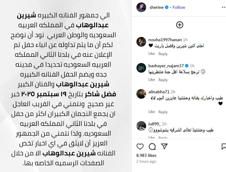 ونشرت شيرين بيان توضيحي عبر صفحتها الرسمية "إنستجرام" وكتبت " إلى جمهور الفنانة الكبيرة شيرين عبدالوهاب فى المملكة العربية السعودية والوطن العربي نود ان نوضح لكم ان ما يتم تداوله عن أنباء حفل تم الإعلان عنه فى بلدنا الثاني المملكة العربية السعودية وتحديدا مدينة جدة ، ويضم الفنانة شيرين عبد الوهاب والفنان فضل شاكر بتاريخ ١٩ سبتمبر ٢٠٢٥ ، خبر غير صحيح