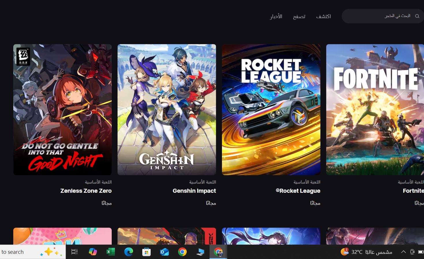 كما يشمل المتجر مجموعة واسعة من الألعاب في مختلف الفئات مثل الأكشن، المغامرات، الرياضة، وألعاب تقمص الأدوار. ومن أشهر الألعاب المجانية التي يمكن تحميلها عبر المتجر: Fortnite، وRocket League، وGenshin Impact وغيرها كالتالي: