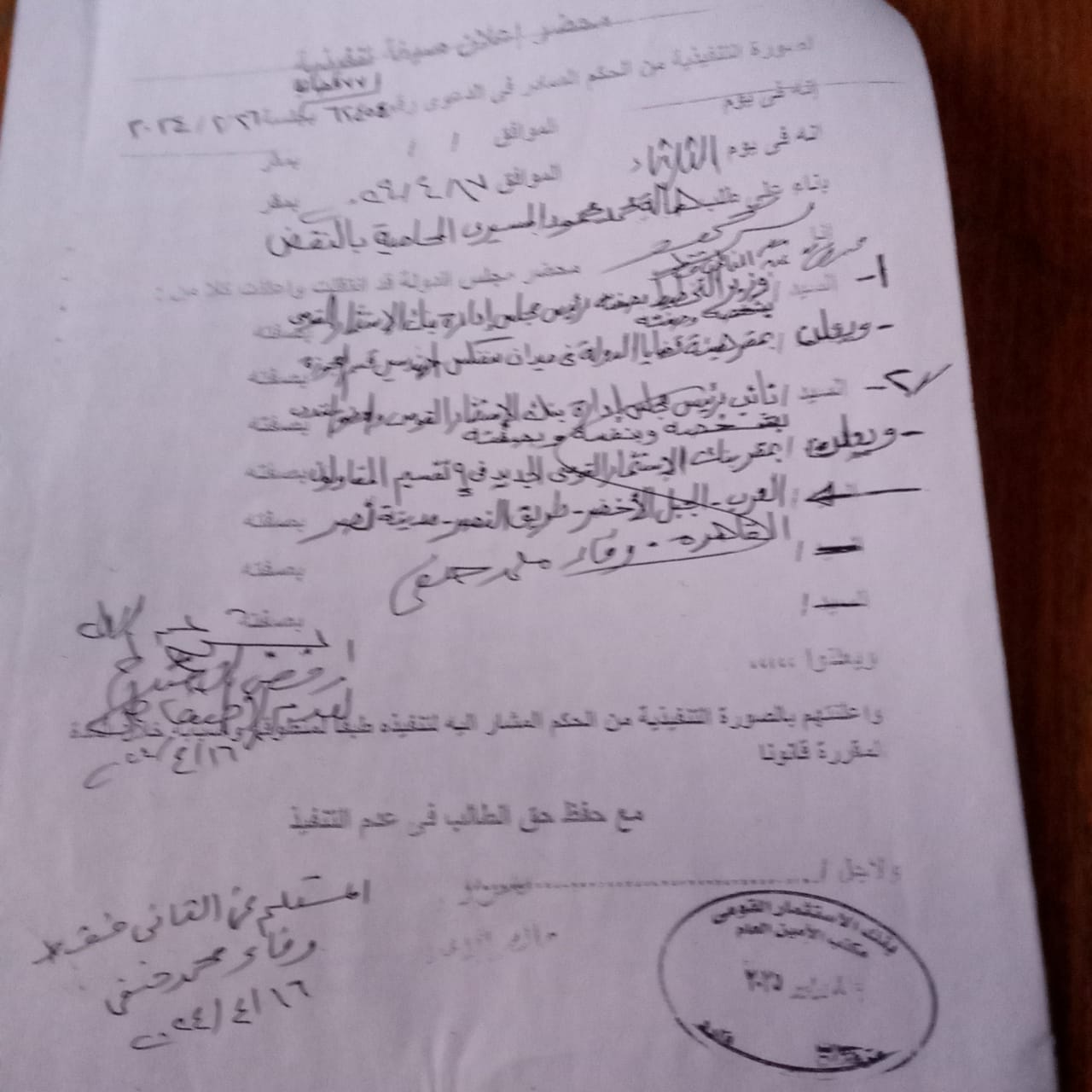 -الحكم الصادر من محكمة القضاء الإداري في الدعوى رقم 62454 لسنة 77 ق بجلسة 26/2/2024 ، القاضي بإلغاء القرار الإداري رقم 42 لسنة 2023 ، وإعادتي إلى وظيفتي (مدير إدارة قانونية بالبنك) مع صرف كافة مستحقاتي المالية إعتبارا من 5/4/2023 وما يترتب على ذلك من أثار .