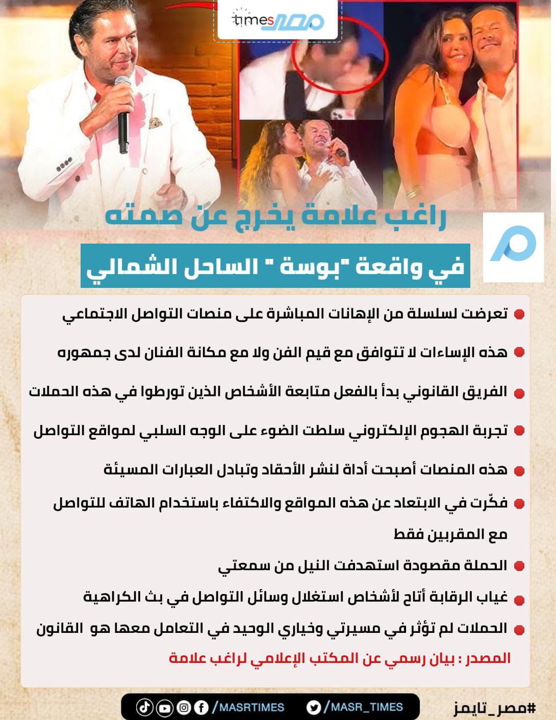 وأوضح أن راغب علامة تخلى عنهم في أزمة والده الأخيرة، وأن تصريحاته ليس لها أساس من الصحة،وتابع حديثة،أن راغب علامة قلقان من عودة والدي إلى الساحة الفنية، وليس لدينا مشكلة نتصالح معه، بس الأهم هو يتصالح مع نفسه.