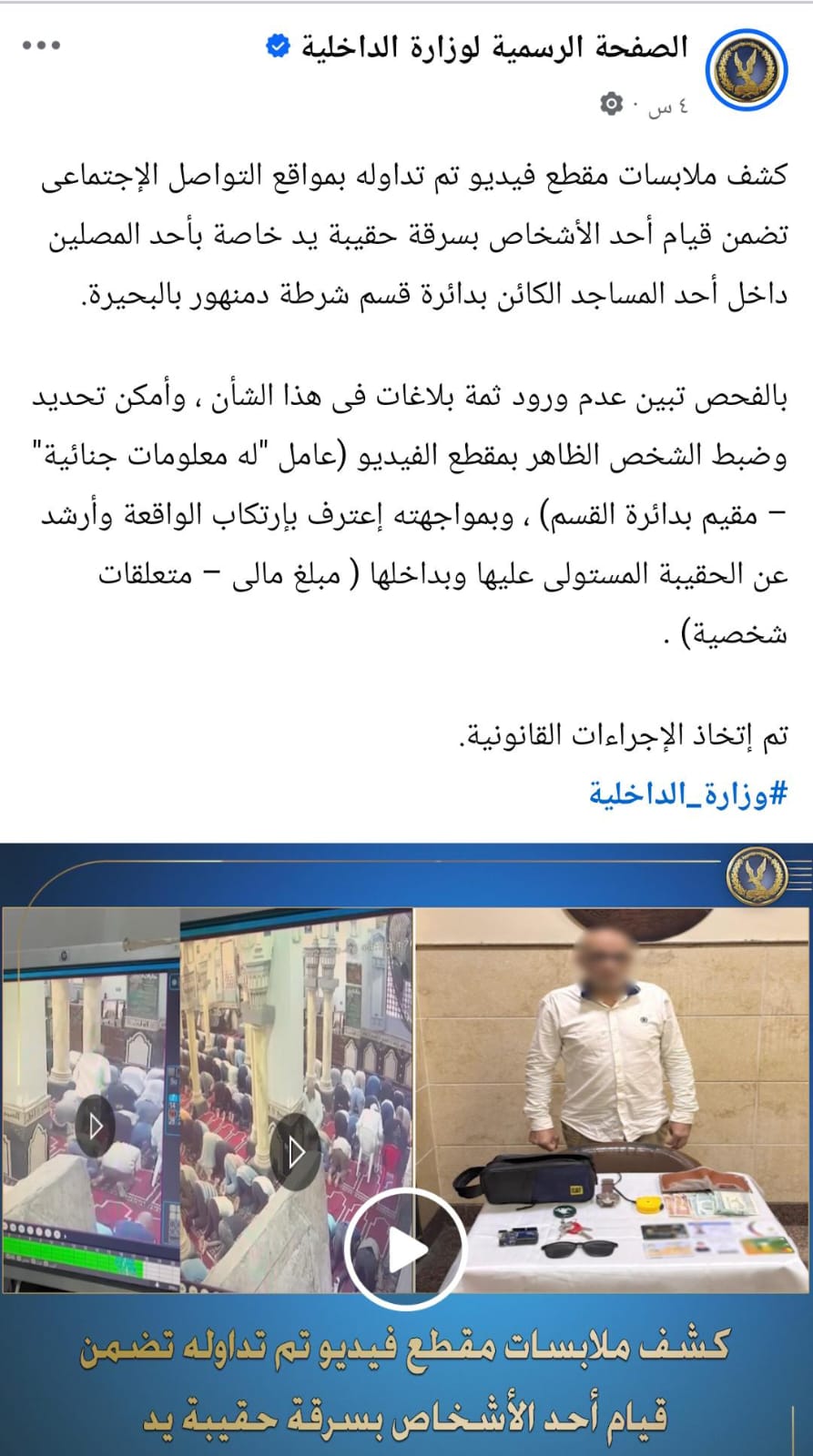 أصدرت وزارة الداخلية بيانًا عاجلًا، كشفت فيه ملابسات مقطع فيديو جرى تداوله عبر مواقع التواصل الاجتماعي، يظهر به قيام أحد الأشخاص بسرقة حقيبة من داخل مسجد التوبه وهو أحد المساجد بدائرة قسم شرطة دمنهور بمحافظة البحيرة، أثناء أداء المصلين صلاة العصر.