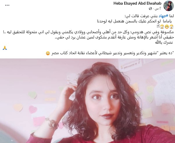 وأضافت في منشورها قائلا "ابنتي جهاد سألتني: يا ماما لو اتحكم عليك بالسجن هنعمل إيه؟! أشعر بالإهانة ولا أعرف لمن أقدم شكواي كي يُرد لي حقي".