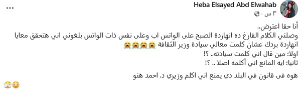 وكانت الكاتبة والشاعرة هبة عبد الوهاب نشرت منشورا عبر صفحتها على "فيسبوك"، مؤكدة أنها فوجئت بخبر تحويلها للتحقيق لمجرد تواصلها مع وزير الثقافة الدكتور أحمد هنو.