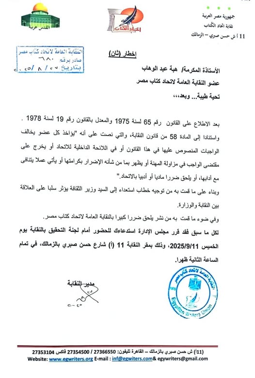قالت الكاتبة هبة عبد الوهاب، عضو اتحاد كتاب مصر وموظفة بالهيئة العامة لقصور الثقافة، إنها فوجئت بقرار استدعائها للتحقيق من قبل اتحاد كتاب مصر، مؤكدة أنها لم تتواصل مطلقًا مع وزير الثقافة في أي شأن يخص اتحاد كتاب مصر.