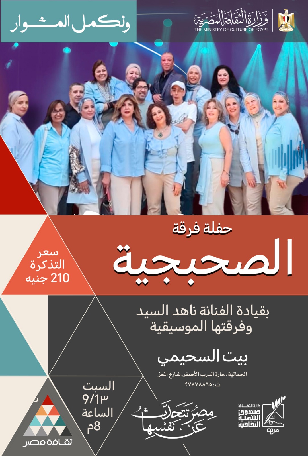 في إطار رسالته الرامية إلى إعادة إحياء مراكز الإبداع التابعة لها، وتحويلها إلى مساحات فنية وثقافية نابضة بالحياة، ينظم صندوق التنمية الثقافية حفلاً موسيقيًا جديدًا لفرقة "الصحبجية" بقيادة الكاتبة الصحفية ناهد السيد، وذلك في الثامنة من مساء غداً (السبت ١٣ سبتمبر الجاري ببيت السحيمي بشارع المعز لدين الله الفاطمي.