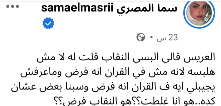 ونشرت الفنانة سما المصري على صفحتها الشخصية "فيسبوك"، منشورًا تتحدث فيه عن النقاب قائلة: "العريس قالي البسي النقاب قلت له لا مش هلبسه لأنه مش في القرآن إنه فرض، وماعرفش يجيبلي إيه في القرآن إنه فرض وسبنا بعض عشان كده..هو أنا غلطت؟؟هو النقاب فرض؟؟".
