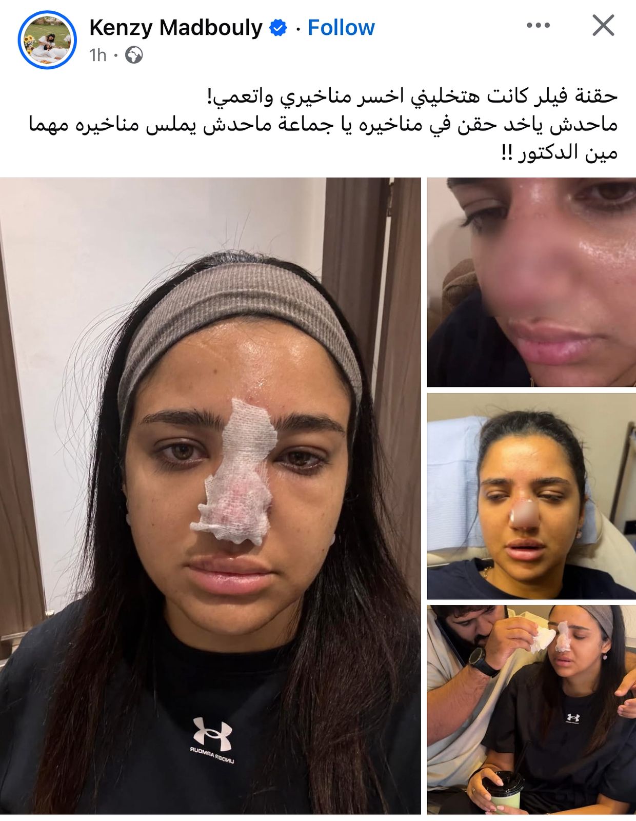 ونشرت كنزي مدبولي صور لها، من خلال حسابها الرسمي عبر موقع التواصل الاجتماعي "فيسبوك"، وكتبت: "حقنة فيلر كانت هتخليني أخسر مناخيري واتعمي، ماحدش ياخد حقن في مناخيره يا جماعة ماحدش يلمس مناخيره مهما مين الدكتور".