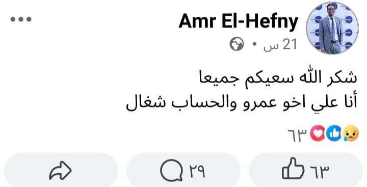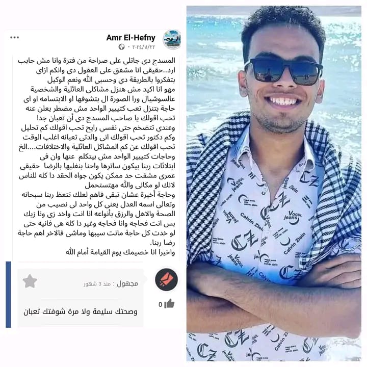وعلق عمرو الحفني على هذه الرسالة قبل أصابته بمرض السرطان عبر صفحته الشخصية "فيسبوك"قائلا: "المسدج دي جاتلي على الصراحة من فترة وأنا مش حابب أرد، وحقيقي أنا مشفق على العقول دي، وإنكم إزاي تفكروا بالطريقة دي، وحسبي الله ونعم الوكيل.