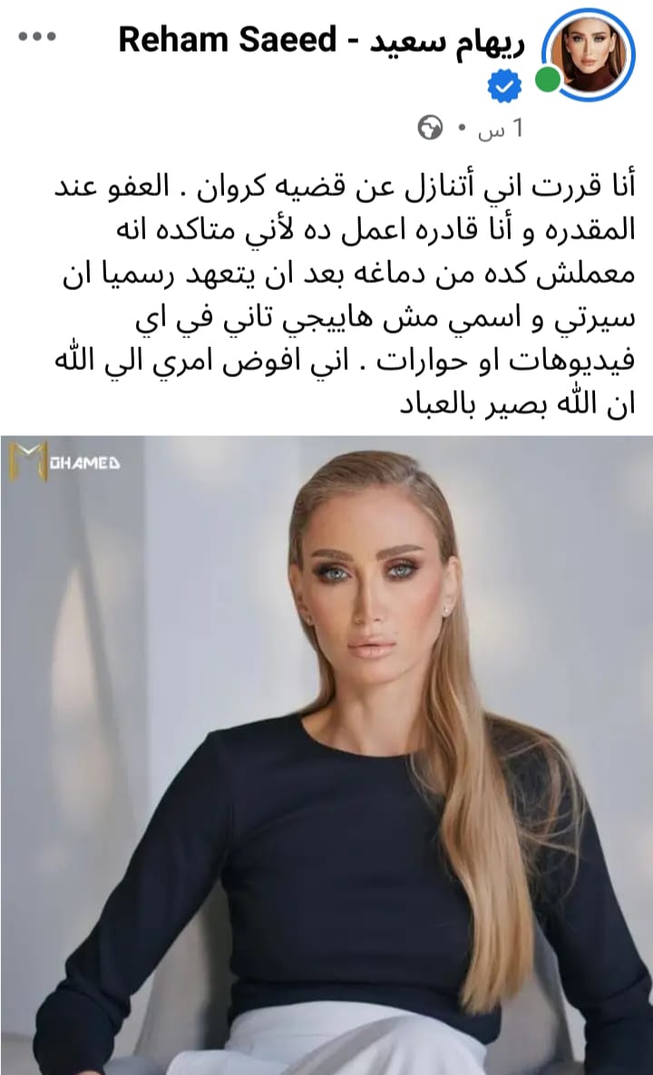 وكتبت الإعلامية ريهام سعيد عبر صفحتها الشخصية "فيسبوك"أنا قررت اني أتنازل عن قضيه كروان . العفو عند المقدره و أنا قادره اعمل ده لأني متاكده انه معملش كده من دماغه بعد ان يتعهد رسميا ان سيرتي و اسمي مش هاييجي تاني في اي فيديوهات او حوارات . اني افوض امري الي الله ان الله بصير بالعباد".