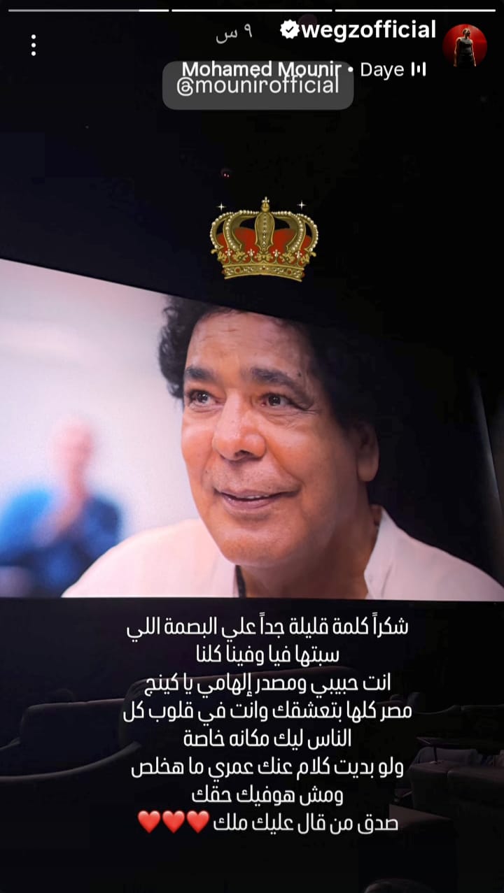 وكتب نجم الراب ويجز عبر خاصية ستوري بصفحته الشخصية بموقع تبادل الصور والفيديوهات القصيرة "انسجرام"،قائلا:"شكرا كلمة قليلة جدا على البصمة اللي سبتها فيا وفينا كلنا،أنت حبيبي ومصدر إلهامي يا كينج،مصر كلها بتعشقك وأنت في قلوب كل الناس ليك مكانة خاصة،ولو بديت كلام عنك عمري ما هخلص ومش هوفيك حقك،صدق من قال عليك ملك".