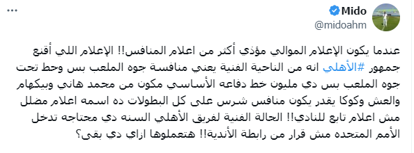 وكتب ميدو عبر حسابه على إكس: عندما يكون الإعلام الموالي مؤذي أكثر من إعلام المنافس!! الإعلام اللي أقنع جمهور الأهلي إنه من الناحية الفنية يعني منافسة جوه الملعب بس وحط تحت جوه الملعب بس دي مليون خط .