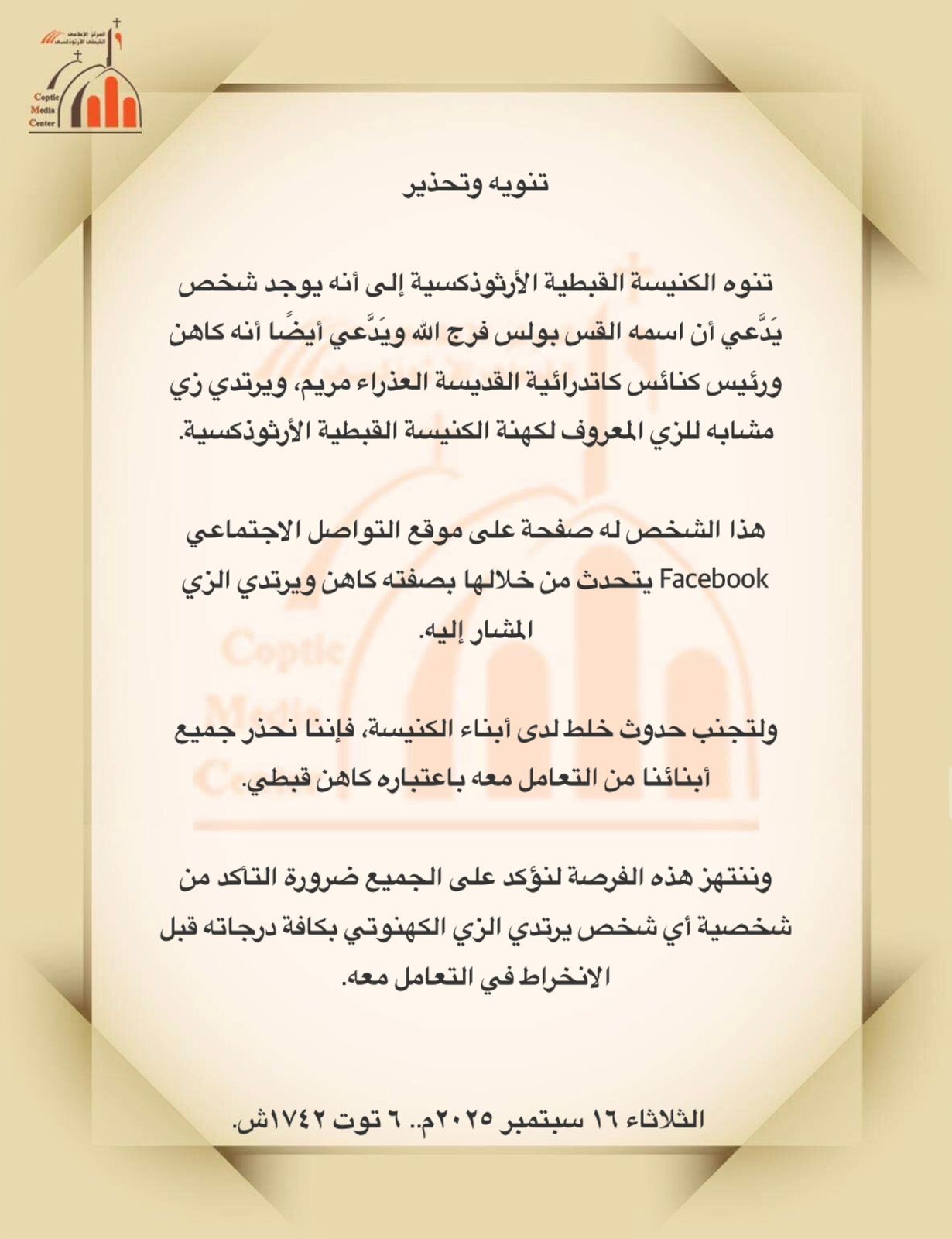 وأضاف البيان، ننتهز هذه الفرصة لنؤكد على الجميع ضرورة التحقق من شخصية أي شخص يرتدي الزي الكهنوتي بكافة درجاته قبل الانخراط في التعامل معه"، مشيرة إلى أن الحفاظ على هيبة الكهنوت ووضوح صفوفه مسؤولية جماعية.