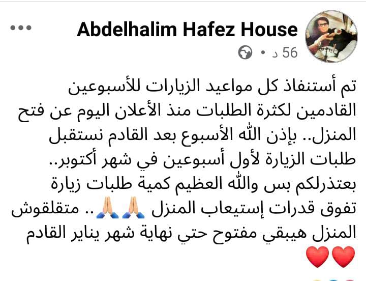 وكتبت أسرة العندليب الراحل عبر صفحة منزل عبد الحليم حافظ"فيسبوك"تم استنفاذ كل مواعيد الزيارات للأسبوعين القادمين لكثرة الطلبات منذ الإعلان اليوم عن فتح المنزل.. بإذن الله الأسبوع بعد القادم نستقبل طلبات الزيارة لأول أسبوعين في شهر أكتوبر.. بعتذرلكم بس والله العظيم كمية طلبات زيارة تفوق قدرات إستيعاب المنزل،متقلقوش المنزل هيبقي مفتوح حتي نهاية شهر يناير القادم".