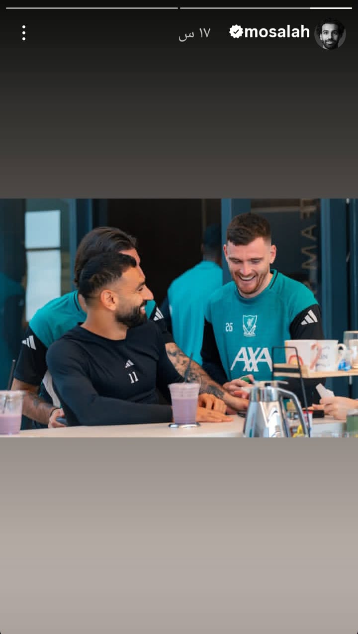 ونشر محمد صلاح عبر "خاصية ستوري"،بموقع تبادل الصور والفيديوهات القصيرة"انسجرام"،صورة جديدة بمفردة من داخل النادي أثناء مرانه اليومي.وصورة أخرى تجمعه مع اللاعب "اندرو روبرتسون".
