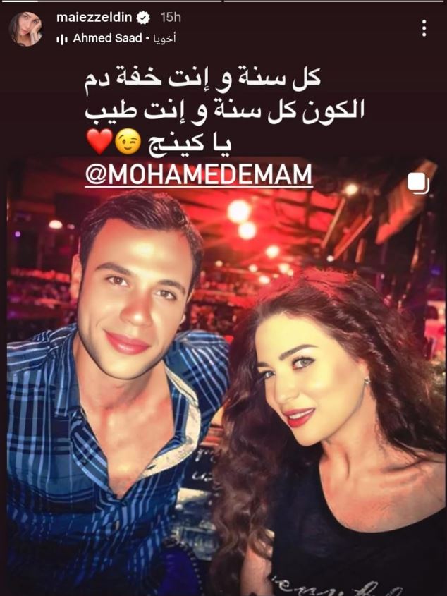 وحرصت الفنانة مي عز الدين على تهنئة الفنان محمد إمام بعيد ميلاده الـ 41، والذي احتفل به مساء أمس الثلاثاء الموافق 16 سبتمبر.