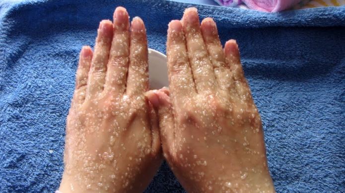 تحضير ملعقتين من السكر وملعقة صغيرة من زيت زيتون بكر، ثم خلط ملعقتين صغيرتين من السكر وملعقة صغيرة من زيت الزيتون في وعاء، مع التقليب للحصول على مقشر ثقيل الملمس، ثم بلل اليدين ووضع الخليط على اليدين مع التدليك بحركة دائرية بأطراف الأصابع ونقعها في ماء دافىء لمدة لمدة 10 دقائق.