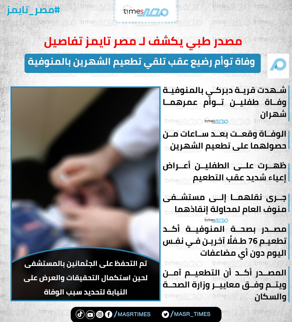 شهدت قرية دبركي التابعة لمركز منوف بمحافظة المنوفية، واقعة مأساوية تمثلت في وفاة طفلين توأم حديثي الولادة، بعد ساعات من حصولهما على تطعيمات الشهرين الروتينية داخل الوحدة الصحية بالقرية.