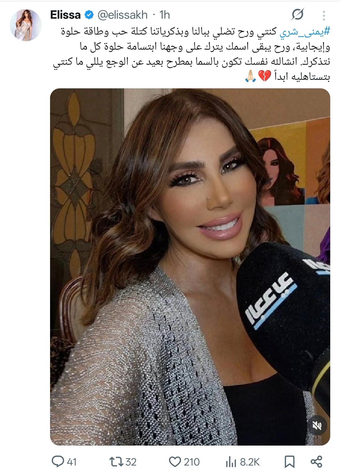 وكتبت الفنانة إليسا عبر صفحتها الشخصية بمنصة "إكس":يمنى شري كنتي ورح تضلي ببالنا وبذكرياتنا كتلة حب وطاقة حلوة وإيجابية، ورح يبقى اسمك يترك على وجهنا ابتسامة حلوة كل ما نتذكرك. انشالله نفسك تكون بالسما بمطرح بعيد عن الوجع يللي ما كنتي بتستاهليه ابداً".