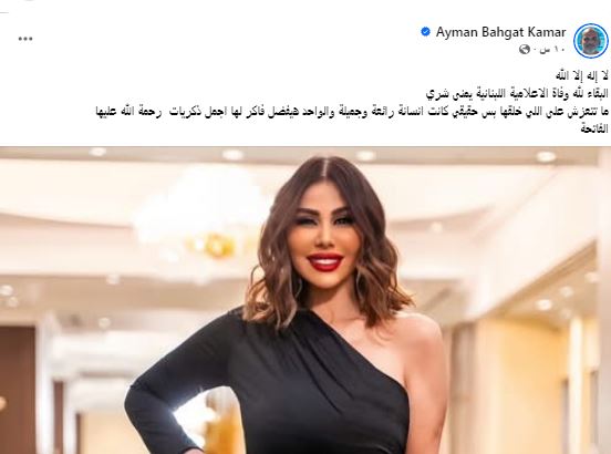 أيمن بهجت قمر ناعيا الإعلامية يمنى شري: "هفضل فاكر لها اجمل ذكريات" (صورة)