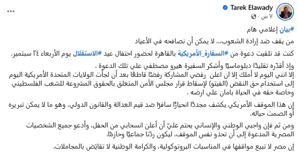 طارق العوضي يرفض دعوة السفارة الأمريكية بالقاهرة احتجاجًا على الفيتو ضد فلسطين