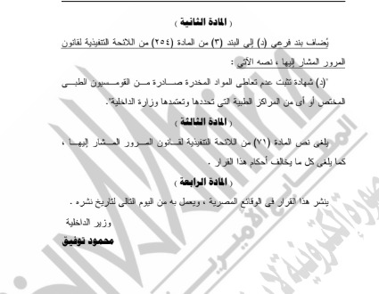 نشرت الجريدة الرسمية اليوم قرار وزارة الداخلية باستبدال نص المادتين 259 "الفقرة الأولى" و261 من اللائحة التنفيذية لقانون المرور المشار إليها، النصان الأتيان: