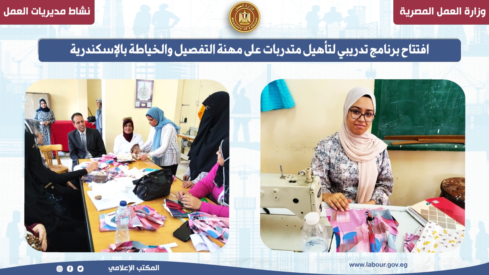 افتتحت مديرية العمل بمحافظة الإسكندرية البرنامج التدريبي الجديد بمركز تدريب مهني شرق، لتأهيل 14 متدربة على مهنة التفصيل والخياطة، وذلك في إطار تنفيذ توجيهات الوزير محمد جبران وزير العمل بتكثيف جهود التدريب المهني، وتوفير فرص حقيقية لتمكين الشباب من الجنسين، دعمًا للاستراتيجية الوطنية للتشغيل، ومكافحة البطالة من خلال نشر ثقافة العمل الحر.