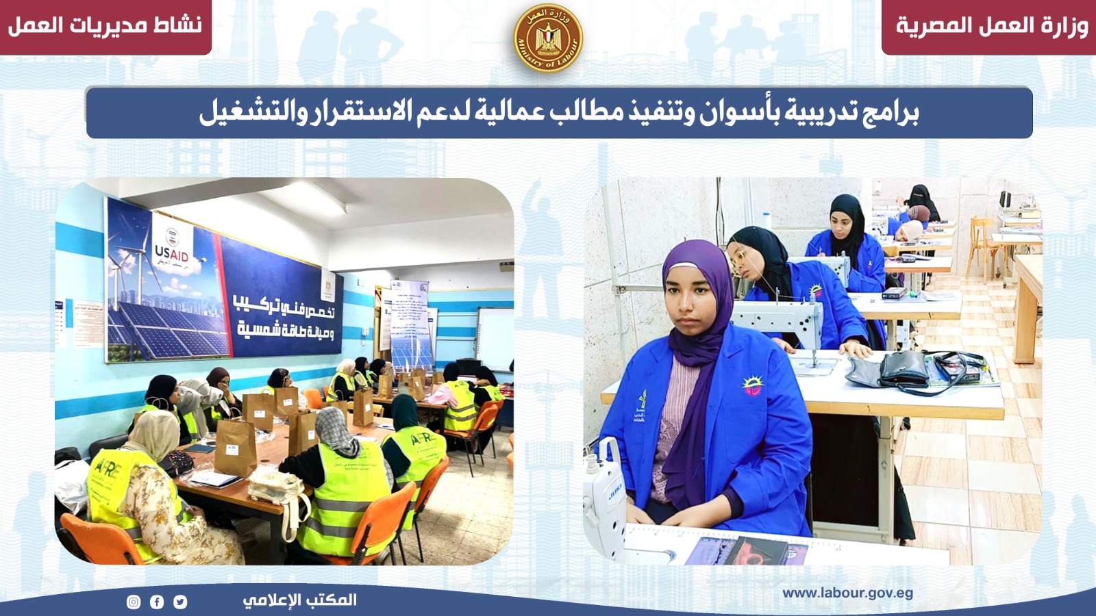 2-برامج تدريبية بأسوان وتنفيذ مطالب عمالية لدعم الاستقرار والتشغيل