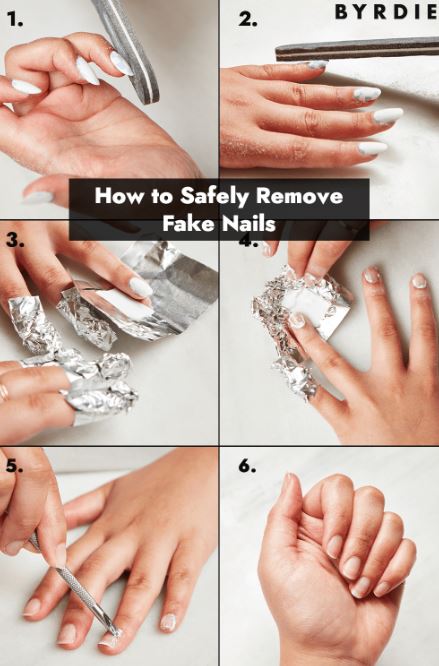 عليك بوضع أصابعك في الأسيتون لمدة ربع ساعة، ويستخدم الملقط في شد الأظافر ويجب ترطيب الأظافر بعدها جيدا باستخدام نوع من المرطبات الخاصة باليدين.