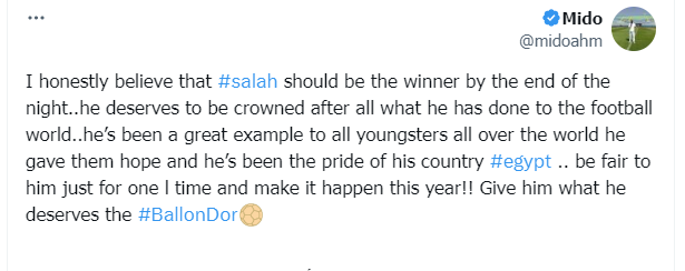 وقال أحمد حسام ميدو، في تغريدة عبر منصة "إكس"، في رسالته التي وجهها لـ البالون دور" بشأن محمد صلاح: "أعتقد بصدق أن محمد صلاح يستحق التتويج في نهاية الليلة.. إنه يستحق التتويج بعد كل ما قدمه لعالم كرة القدم.. لقد كان قدوة حسنة لجميع الشباب حول العالم، منحهم الأمل وكان فخرًا لبلاده مصر.."