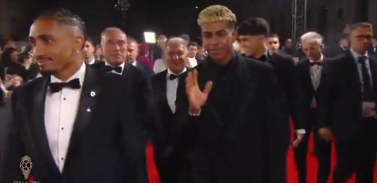ووصل لامين يامال برفقة زملائه، نجوم برشلونة، والألماني هانز فليك، المدير الفني لفريق حفل الكرة الذهبية، من أجل حضور الحفل، والانتظار لإعلان اسم الفائز بجائزة هذا الموسم.