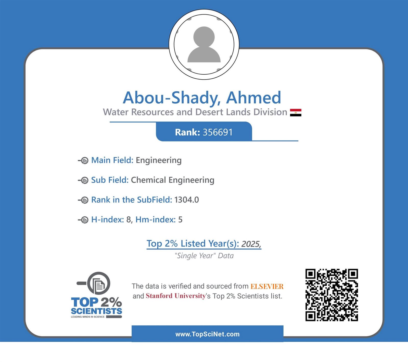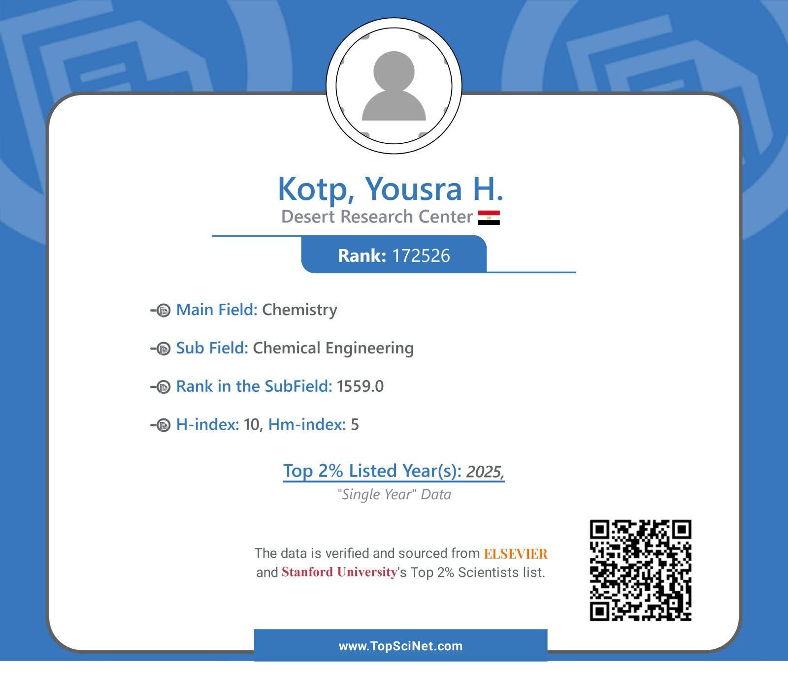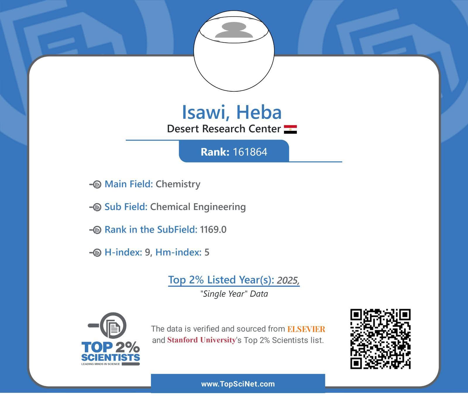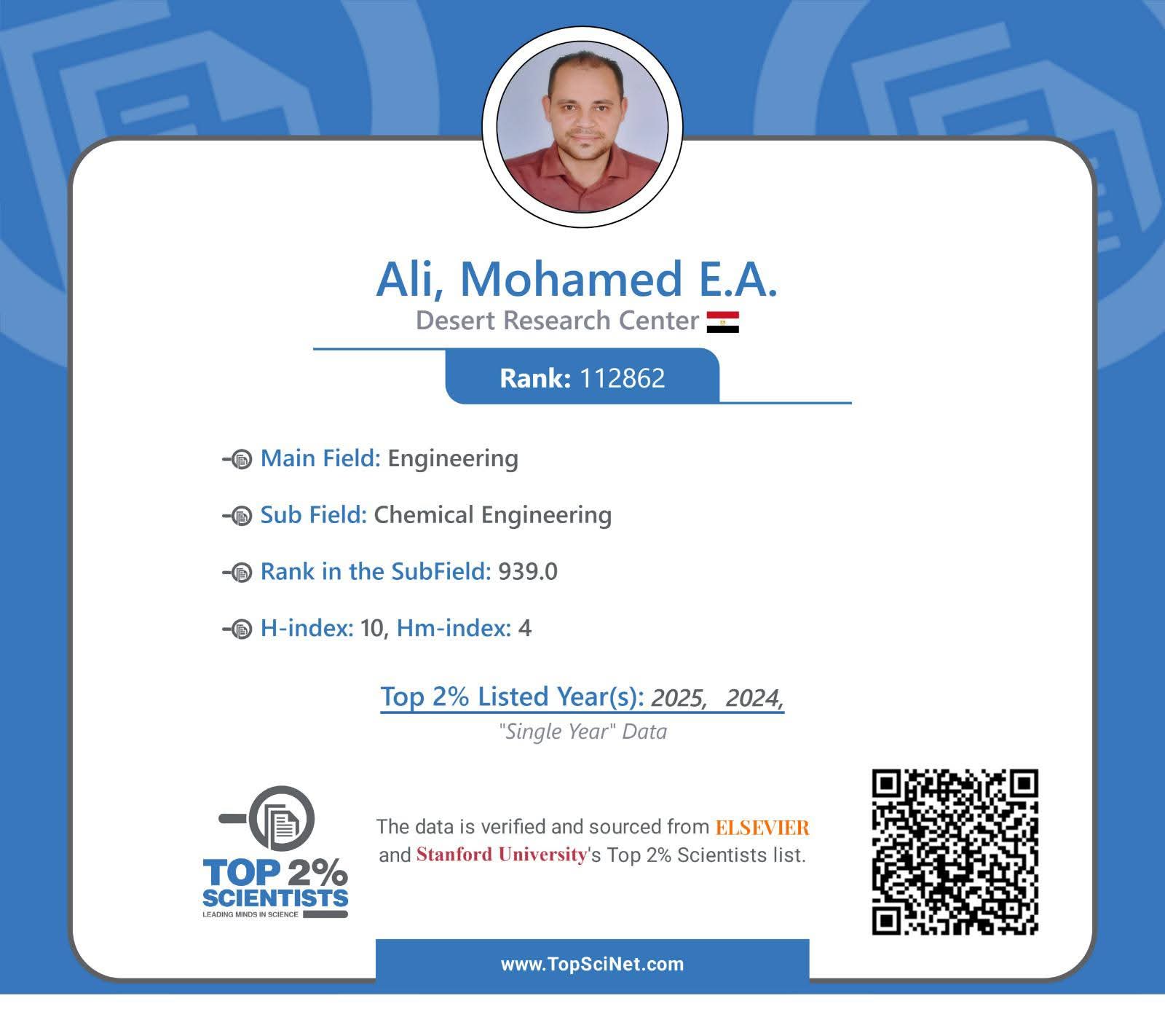 أعلنت وزارة الزراعة واستصلاح الأراضي، ان التصنيف الذي اصدرته جامعة ستانفورد الأمريكية، بالتعاون مع مؤسسة السفير العالمية، لأفضل 2% من العلماء الأكثر تأثيرًا حول العالم، قد شمل أيضا 4 علماء من مركز بحوث الصحراء، وهم: الدكتور محمد السيد عبد الفتاح والدكتوة يسرا حافظ قطب والدكتوة هبه عيسوى من قسم الهيدروجيوكيمياء، والدكتور احمد ابو شادى من قسم كيمياء وطبيعة الاراضى بشعبة مصادر المياه والأراضي الصحراوية.