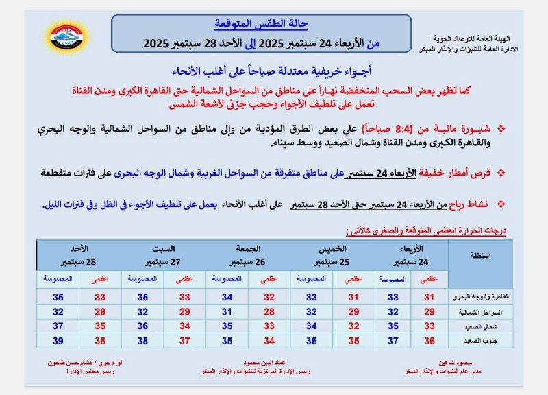 سجلت الهيئة في نشرتها تفاصيل درجات الحرارة العظمى والصغرى المتوقعة خلال الفترة من الأربعاء حتى الأحد، حيث تتراوح العظمى على القاهرة الكبرى والوجه البحري بين 32 و34 درجة، بينما تكون الصغرى بين 23 و25 درجة.
