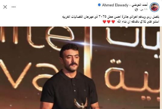 أول تعليق من أحمد العوضي بعد فوزه بجائزة أحسن ممثل بمهرجان الفضائيات العربية (صورة)