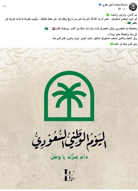 وقالت ليلي عبر صفحتها الرسمية "فيس بوك"" بلد الأمان، والرقي، والدفء في اليوم الوطني السعودي… بحس قد ايه العلاقة اللي بينّا مش بس تاريخ وجغرافيا، لكن محبة حقيقية… وقلوب عمرها ما كانت غريبة عن بعض".
