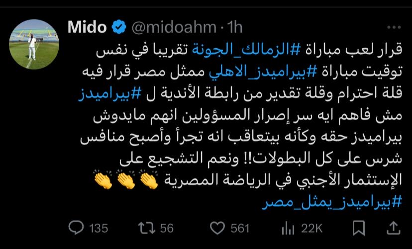 وقال ميدو في منشور له عبر حسابه على إكس: قرار لعب مباراة الزمالك والجونة تقريبا في نفس توقيت مباراة الأهلي وبيراميدز ممثل مصر قرار فيه قلة احترام وقلة تقدير من رابطة الأندية لبيراميدز.
