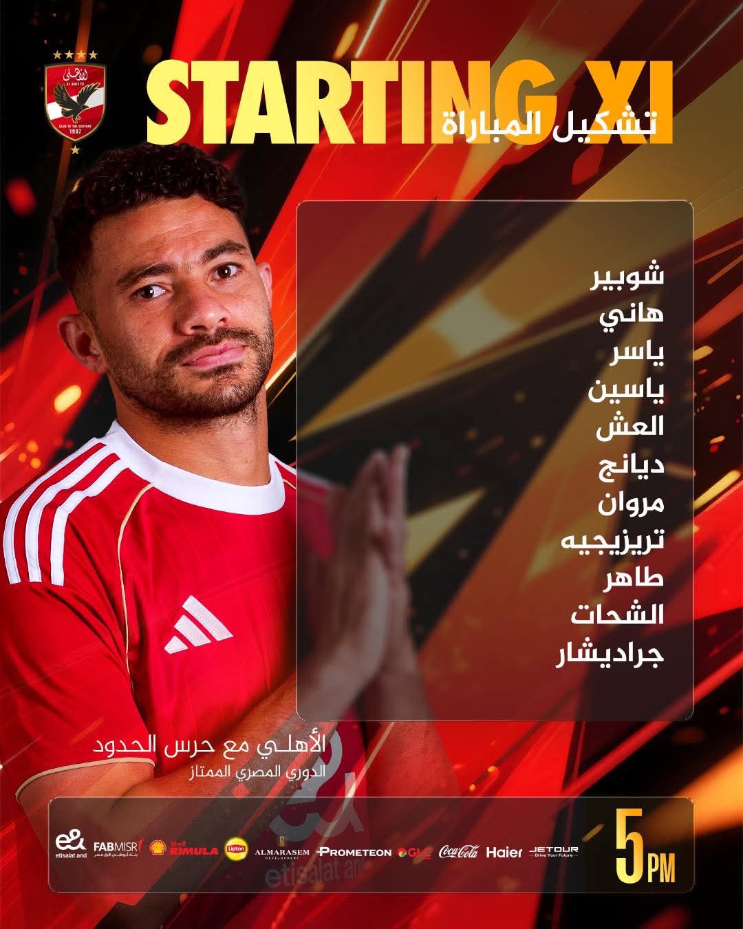 خط الوسط: أليو ديانج – مروان عطية – محمود حسن تريزيجيه – حسين الشحات – طاهر محمد طاهر