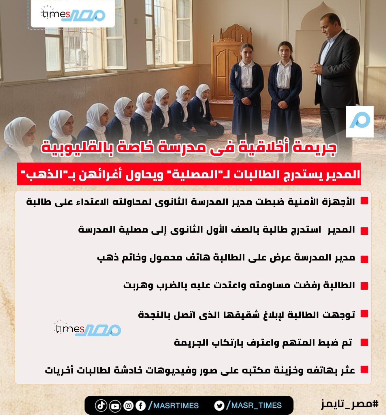 استبعاد مدير المدرسة المتهم باستدراج الطالبات إلى المصلية للتعدى عليهن فى شبين القناطر