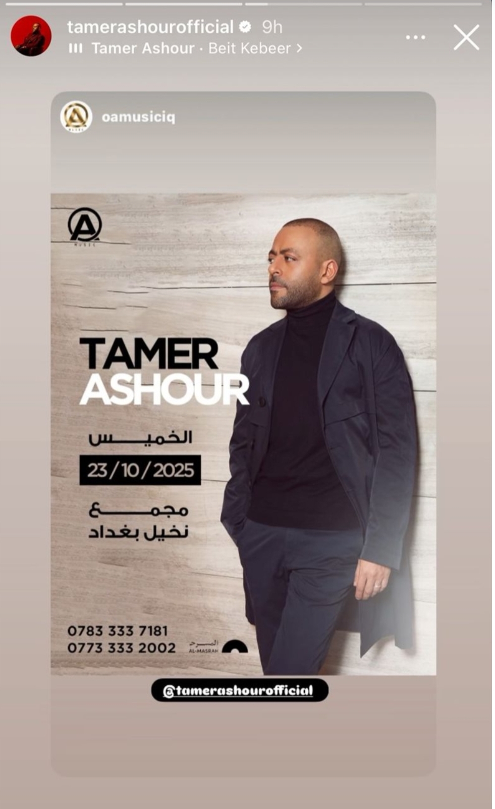 أكتوبر.. تامر عاشور يستعد لإحياء حفلًا غنائيًا ضخمًا في العراق