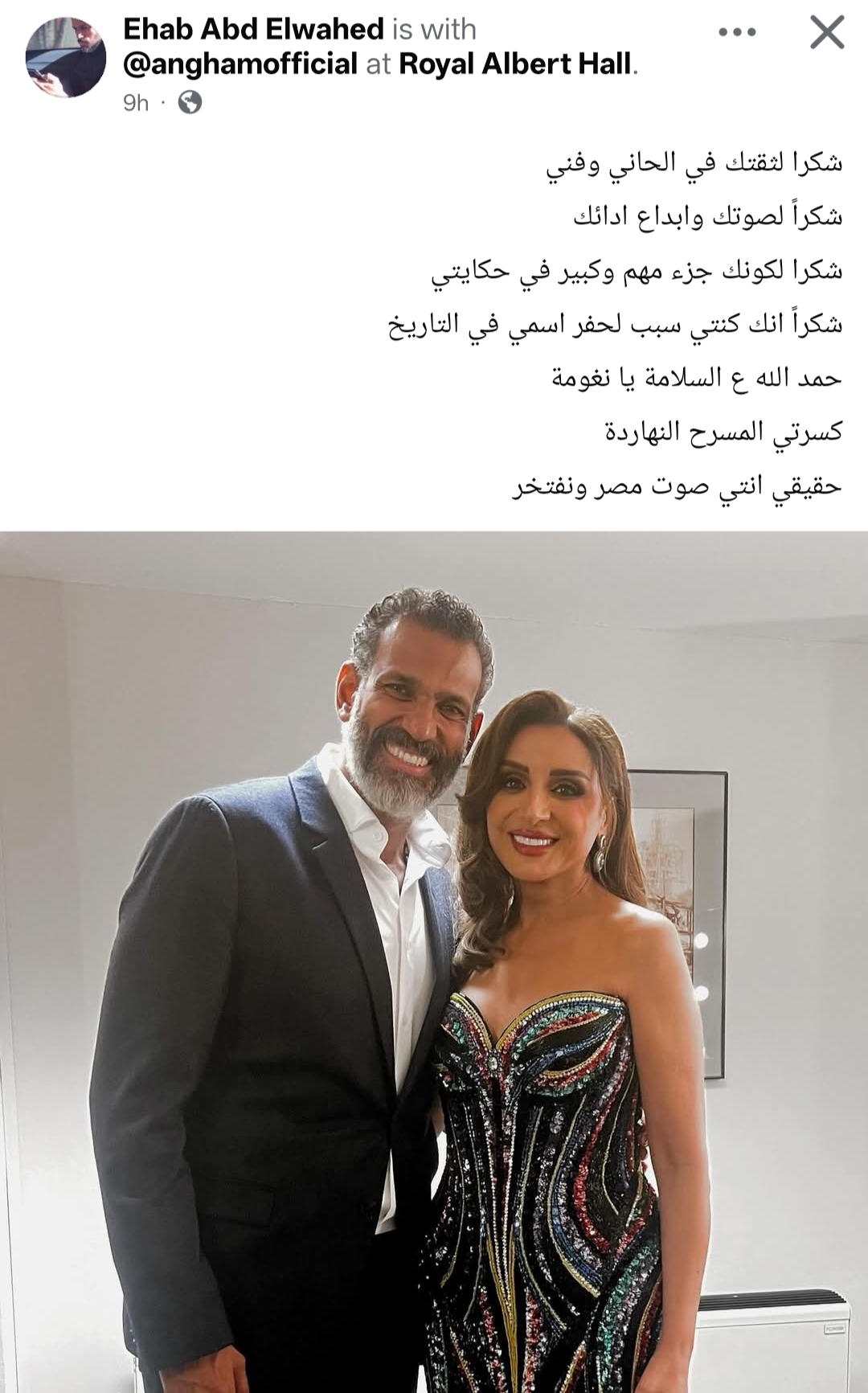 ونشر إيهاب عبد الواحد صورة تجمعه بأنغام، وذلك من خلال حسابه الرسمي عبر موقع التواصل الاجتماعي فيسبوك، وكتب: "شكرًا لثقتك في ألحاني وفني.. شكرًا لصوتك وإبداع أدائك.. شكرًا لكونك جزء مهم وكبير في حكايتي.. شكرًا انك كنتي سبب لحفر اسمي في التاريخ.. حمد الله على السلامة يا نغومة.. كسرتي المسرح النهاردة