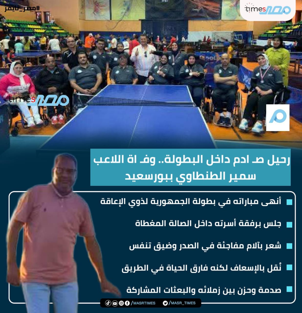 خيمت أجواء من الحزن داخل الصالة المغطاة بالمدينة الرياضية في بورسعيد، مساء اليوم، عقب وفاة اللاعب سمير الطنطاوي، لاعب نادي العزيمة بالإسماعيلية، خلال مشاركته في بطولة الجمهورية لتنس الطاولة لذوي الإعاقة.