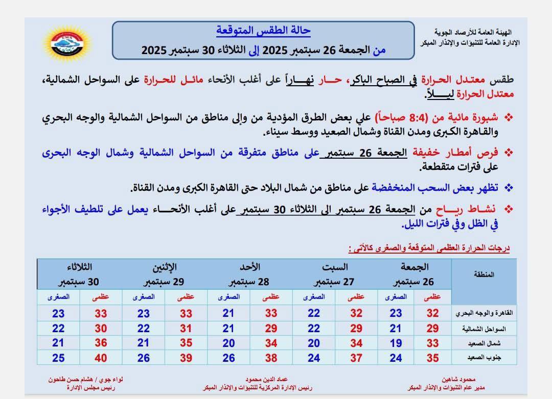وفيما يلي يستعرض لكم موقع مصر تايمز، خلال السطور التالية تفاصيل حالة الطقس غدًا الجمعة 26 سبتمبر 2025.