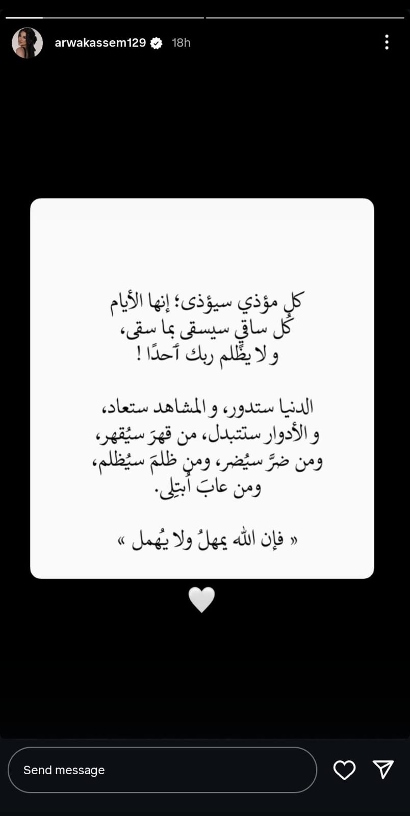 ونشرت أروى قاسم رسالة غامضة، من خلال حسابها الرسمي عبر موقع تبادل الصور والفيديوهات القصيرة "إنستجرام"، وقالت: كل مؤذي سيؤذى، إنها الأيام، كل ساقي سيسقى بما سقى، الدنيا ستدور والمشاهد ستعاد والأدوار ستتبدل، من قهر سيقهر، ومن ضر سيضر، ومن عاب أُبتلى، فإن الله يمهل ولا يهمل".